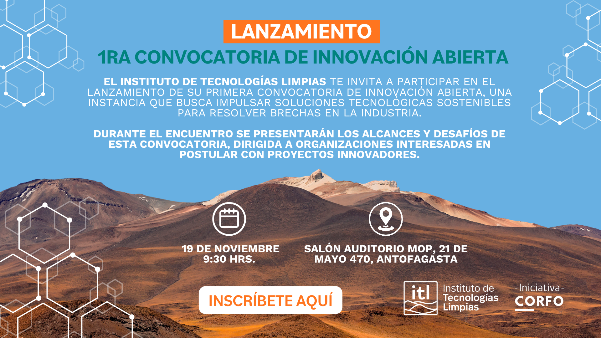 Antofagasta, noviembre de 2025.– Con el propósito de acelerar el desarrollo de soluciones tecnológicas sostenibles desde el norte de Chile hacia el mundo, el Instituto de Tecnologías Limpias (ITL) llevará a cabo el lanzamiento de su Primera Convocatoria de Innovación Abierta, una iniciativa que también busca fortalecer las capacidades del Instituto y fomentar la vinculación entre empresas, academia y emprendedores para responder a los desafíos de la transición energética y la industria nacional.