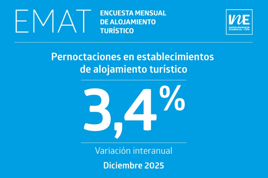 Las pernoctaciones de pasajeros en establecimientos de alojamiento turístico en Chile (número total de noches que las personas alojaron) llegaron a 1.745.152 en diciembre de 2025, lo que implicó un aumento de 3,4% en doce meses, respecto al mismo mes del año anterior. Así lo revela la Encuesta Mensual de Alojamiento Turístico (EMAT) publicada esta mañana por el Instituto Nacional de Estadísticas (INE).