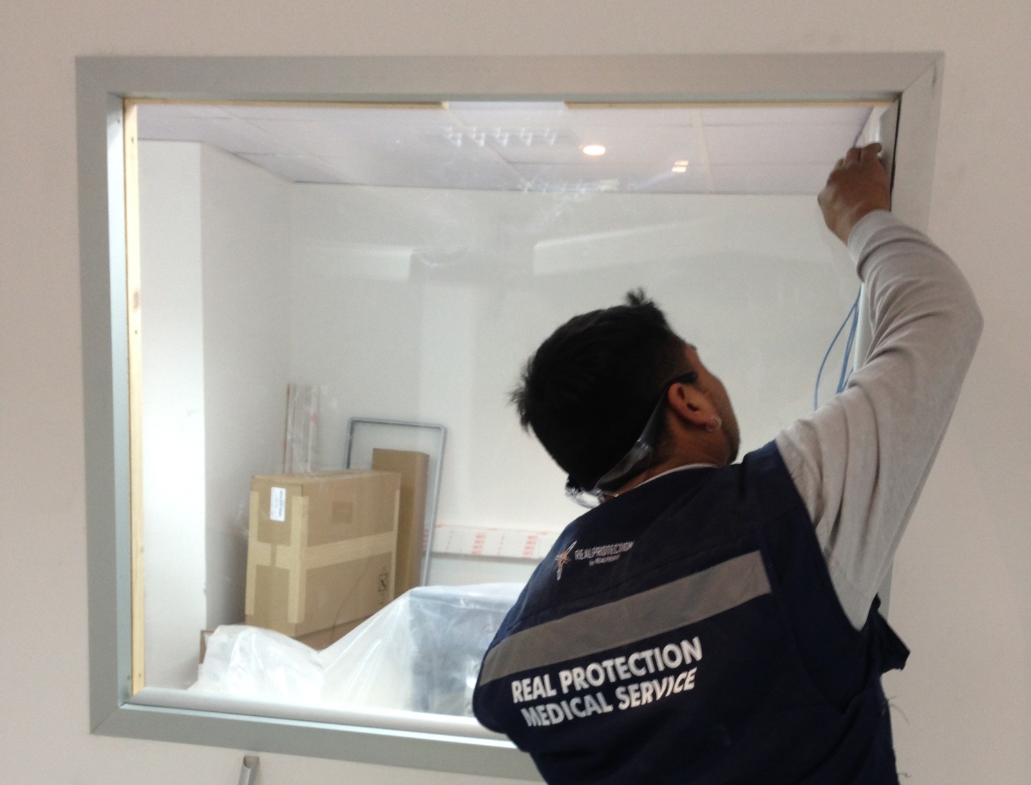 Protección propia de los recintos con blindajes como biombos plomados, vidrios plomados, láminas plomadas.