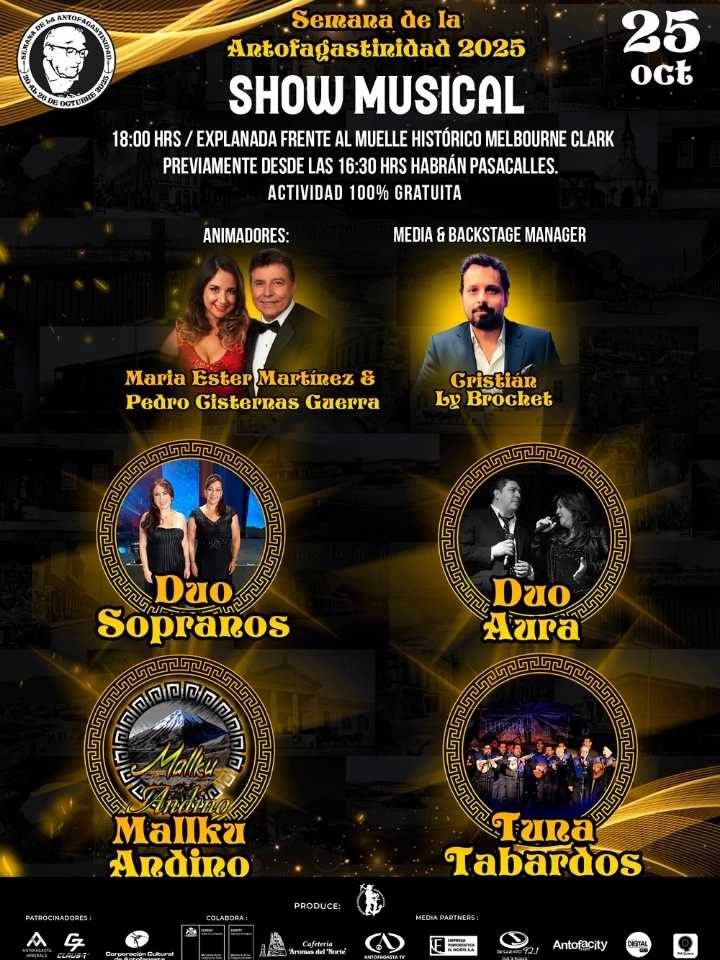 El show final partirá a las 18:00 horas y será amenizado por los dúos ’Sopranos Antofagasta’ y ‘Aura’ y la agrupación Mallku Andino, para finalizar con la Tuna Tabardos. Las restantes actividades serán difundidas en Facebook, a través del grupo ‘Antofagasta ayer, hoy y siempre’ y la página ‘Semana de la Antofagastinidad’, al igual que en las cuentas @identidadantofagastina y @elorgullodeserdeantofagasta.