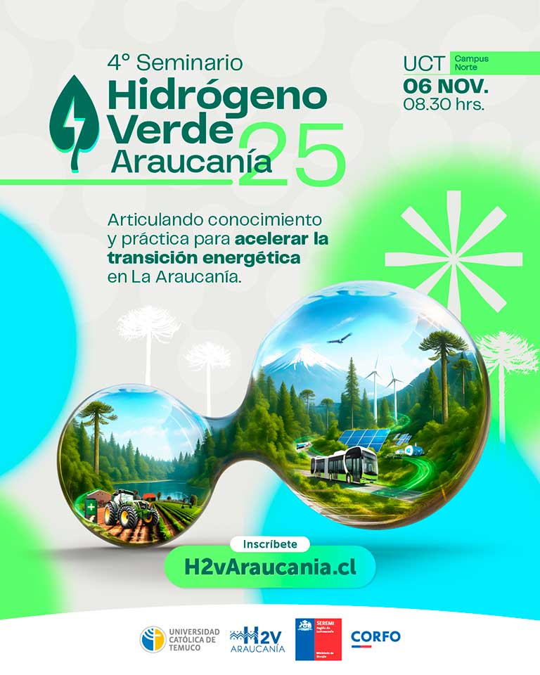 El próximo jueves 6 de noviembre, a partir de las 8:30 horas, se desarrollará el 4° Seminario de Hidrógeno Verde en La Araucanía 2025, bajo el lema “Articulando conocimiento y práctica para acelerar la transición energética en la Región de La Araucanía”. La actividad se realizará en el Auditorio del Edificio Adalberto Salas del Campus San Juan Pablo II de la Universidad Católica de Temuco, ubicado en Rudecindo Ortega 2959, Temuco.