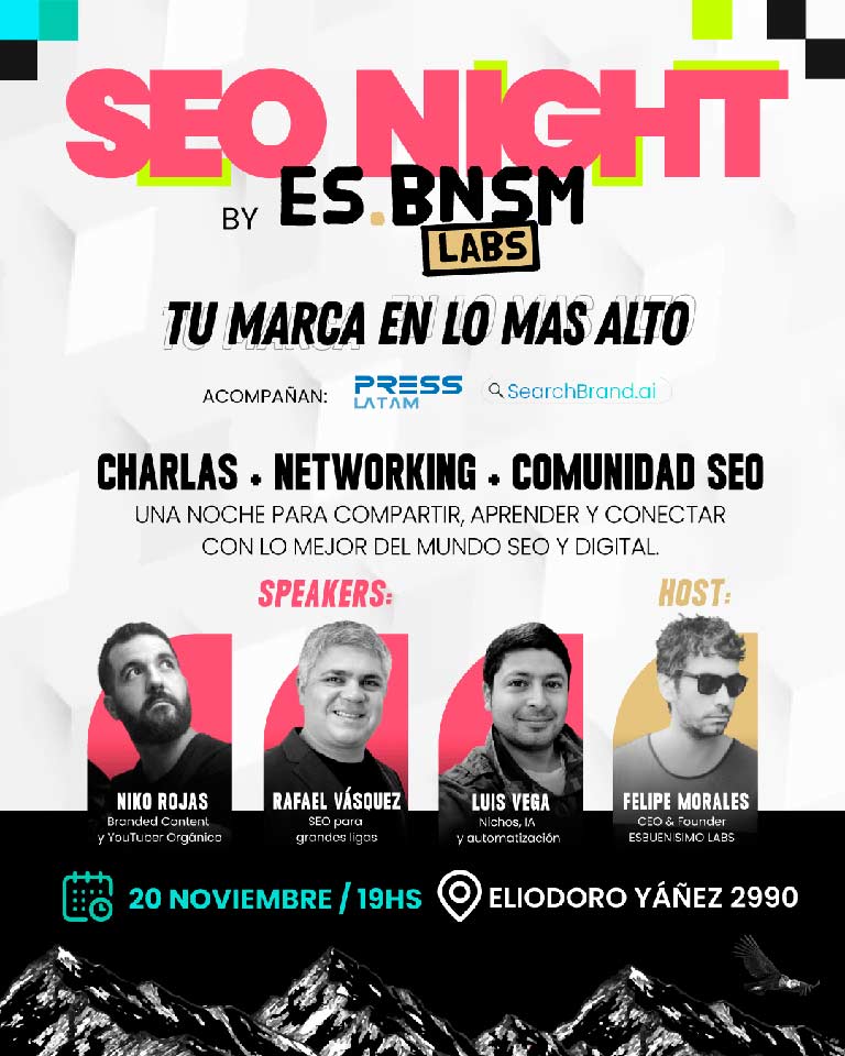 En un formato cercano, práctico y sin formalidades, SEO Night Santiago 2025 se perfila como el evento más honesto del año para quienes viven del posicionamiento orgánico, el contenido digital y el marketing de resultados. Organizado por ESBUENISIMO LABS, la cita será el jueves 20 de noviembre a las 19:00 hrs en Eliodoro Yáñez 2990, comuna de Providencia.